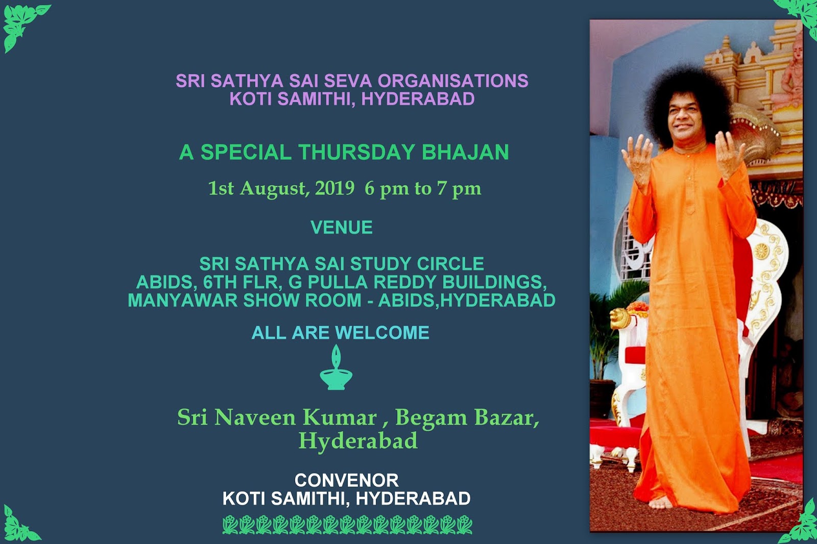 ఈ నాటి భజనలో పిల్లలు, పెద్దలు, అందరూ పాల్గొన్నారు. శ్రీ హరి, ఆశ్రిత, సమితి కన్వీనర్ విశ్వేశ్వర శాస్త్రి, బాలవికాస్ గురువు, శ్రీమతి రేణుక, కుమారి సాయి వాణి, ప్రణవ్, సాయి రూప, సాయి లక్ష్మి, గాయత్రీ నాగ, హేమాంగ్, సాయి కుమార్, సాయి గుప్తా, నీలిమ, శైలేశ్వరి, నవీన్, లీలాధర్, సునీత, భాగ్య లక్ష్మి, మల్లికార్జున్, మన్యవార్ స్టాఫ్ ( 3) మెంబెర్స్, విజయ లక్ష్మి, ( మహిళా ఇంచార్జి), కల్పన, పాల్గొన్నారు. శ్రీమతి సునీత స్వామి వారి సందేశాన్ని, కోరికల పై నియంత్రణ సందేశాన్ని వినిపించారు. స్వామి వారి 94 వ జన్మ దినోత్సవ వేడుకలో భాగంగా, భగవానుడు నడయాడిన శివమ్ మందిర ప్రాంగణంలో, ఆగష్టు 4 వ తేదీన, 2019న , హైదరాబాద్ జిల్లాలోని, బాలవికాస్ విద్యార్థులు 94 భజనల మాలను స్వామికి సమర్పించనున్నారు. అందులో భాగంగా, కోటిసమితి లో 13 మంది కలసి కొన్ని భజన పుష్పాలను సమర్పించనున్నారు. ఆ పుష్పాలను భజన మందిరంలో ముందుగా ఈ రోజు సమర్పించి, అందరి మన్నలను పొందినారు. (3) శశివధన్, రుత్విక్, శ్రాగ్వి హాజరు కాలేదు. మన ఆహ్వానాన్ని మన్నించి విచ్చేసిన నవీన్ గారు స్వామి వారికీ మంగళ హారతి ని సమర్పించారు. శ్రీ మన్యవార్ మల్లికార్జున్ గారు ప్రసాదాన్ని తీసుకొని వచ్చి, పిల్లలతో బ్రహ్మార్పణం అనంతరం, సాయి గాయత్రీ నామాన్ని జపించుకుంటూ స్వామి దర్శనం గావించుకుని, అందరూ స్వామి ప్రసాదాన్ని తీసుకొని వెళ్ళినారు. జై సాయి రామ్.