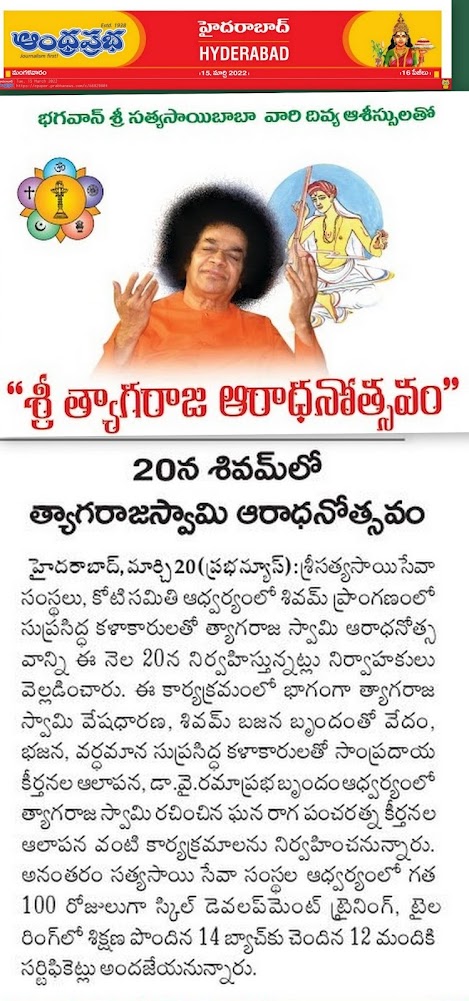 భగవాన్ శ్రీ సత్యసాయి బాబా వారి దివ్య అనుగ్రహాముతో, శ్రీ సత్య సాయి సేవ సంస్థలు కోటి సమితి ఆధ్వర్యములో 22-3-2022 న సాయంత్రము 5-30 గంటలకు, భగవానుడు నడయాడిన విద్యానగర్ లో గల శివమ్ ప్రాంగణంలో సద్గురు శ్రీ త్యాగరాజ స్వామి వారి ఆరాధనోత్సవం భక్తి శ్రద్దలతో జరిగింది.